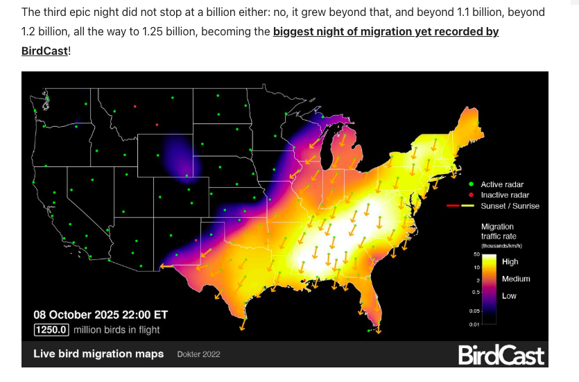 Este año 2025 BirdCast, reportó la más grande migración de aves, 1. 25 billones de aves volando en una noche. En Miami el 13 de octubre del 2025, Migration Alert, alertó que 9, 000 aves pasarían volando por la región durante la noche.