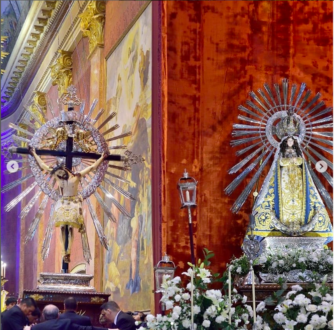 • Las Imágenes: La imagen del Señor del Milagro es la original, aunque su cruz de algarrobo es la tercera, fue reforzada para soportar el peso de sus adornos. La Virgen, por su parte, es la misma que cayó en el terremoto, pero fue modificada a fines de 1800 para que sus codos y muñecas fueran articulados, lo que permite vestirla.