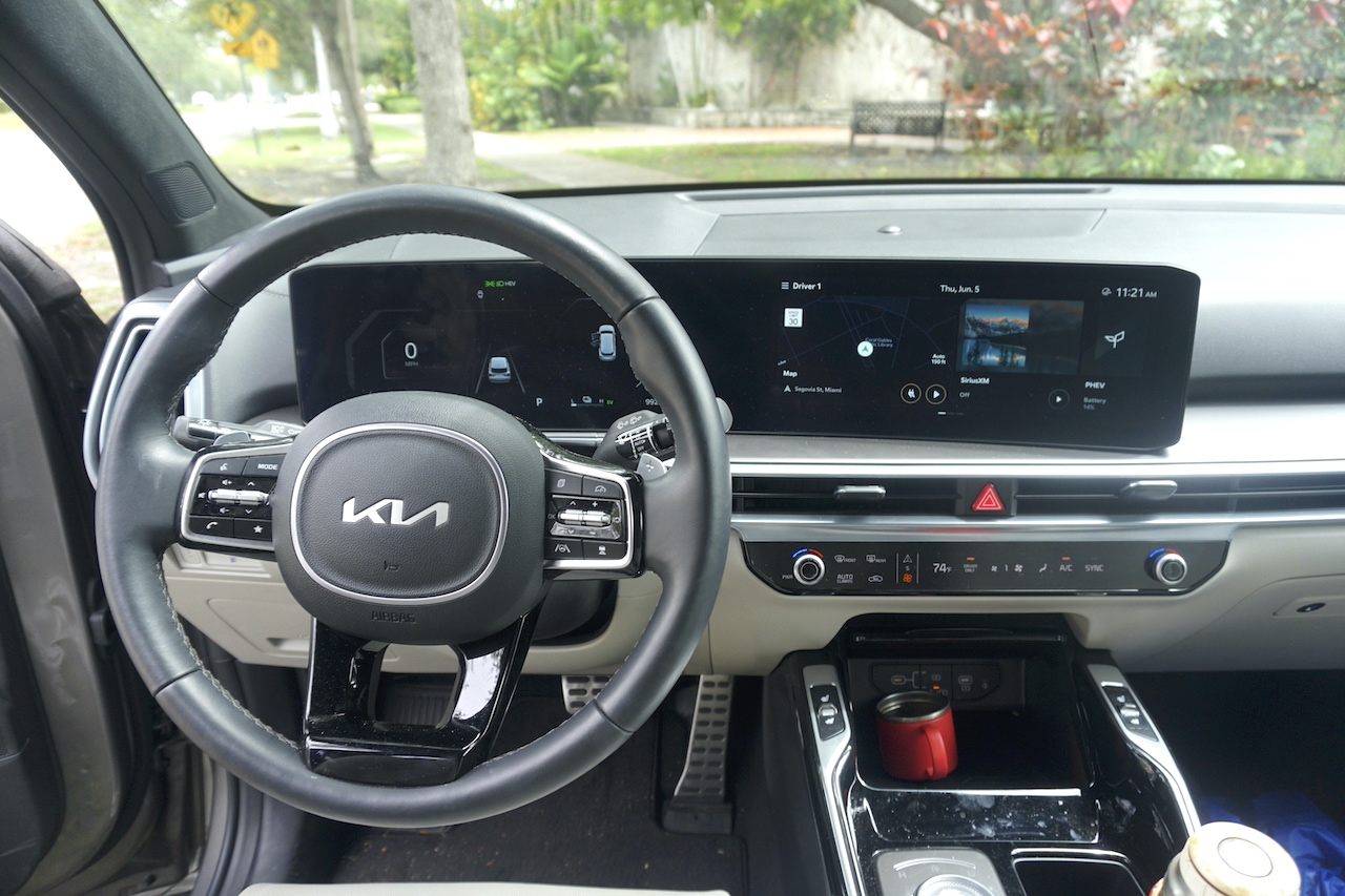 Experiencia en el timón mientras conducíamos: Aunque el Kia Sorento es un SU de tamaño grande, la conducción del timón es suave y fácil de maniobrar en giros y estacionamiento gracias a la cámara que asiste con visión 360″ y la manera en que ha sido diseñado el auto para familias.