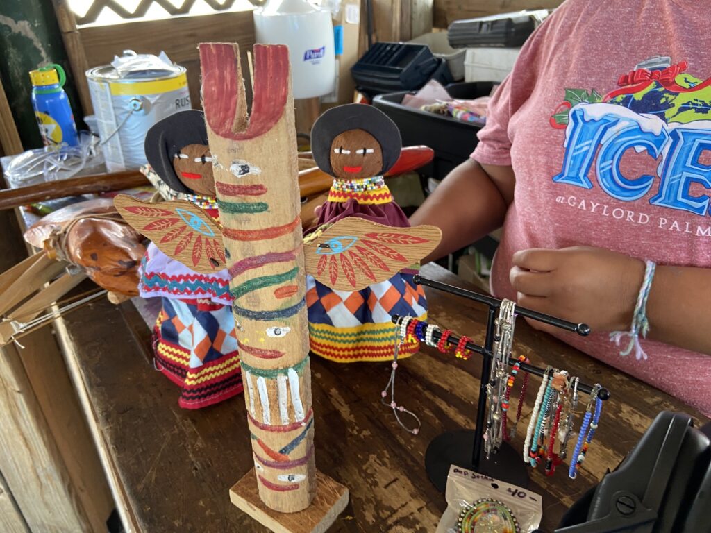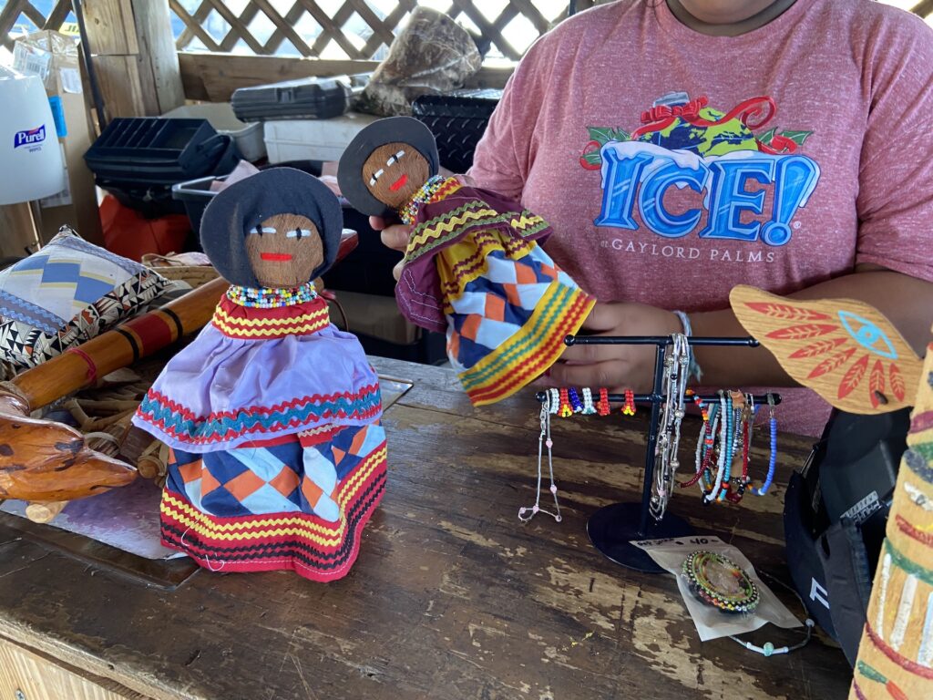 Cuando llegamos a TigerTail Airboat Tours, para mi sorpresa nos esperaban los niños miccosukee. Sobre una mesa de madera la mayor de ellos, una niña muy disciplinada, había organizado su colección de obras de artesanía. Sus muñecas, tapetes, ropa y prendas. Pero tenía más y lo fue sacando poco a poco, a medida que descubrió nuestro interés. Respondió a nuestras preguntas.