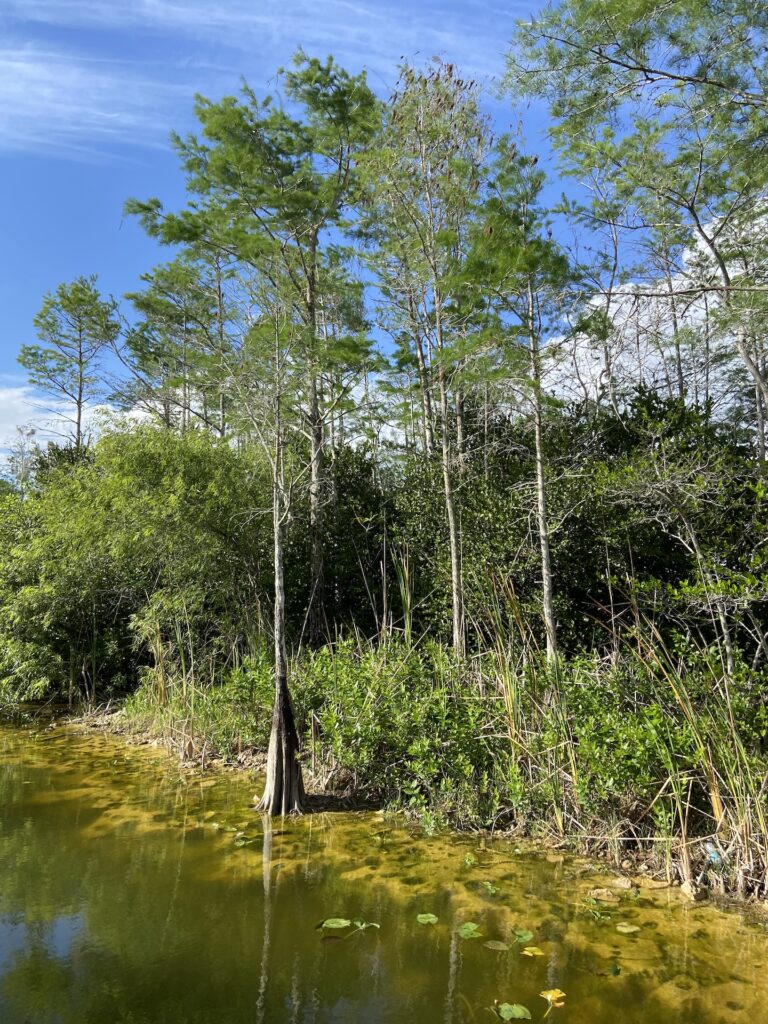 Esta vez no navegamos rápido por el Rio de Hierba y las garzas sobrevolaban la lancha curiosas a pesar del ruido. Cuando entramos al canal de Big Cypress, el piloto apagó todo. En uno de los pinos antiguos, la hermosa ( Espátula Rosada – Roseta Spoonbill) nos miró pasar y se quedó tranquila.